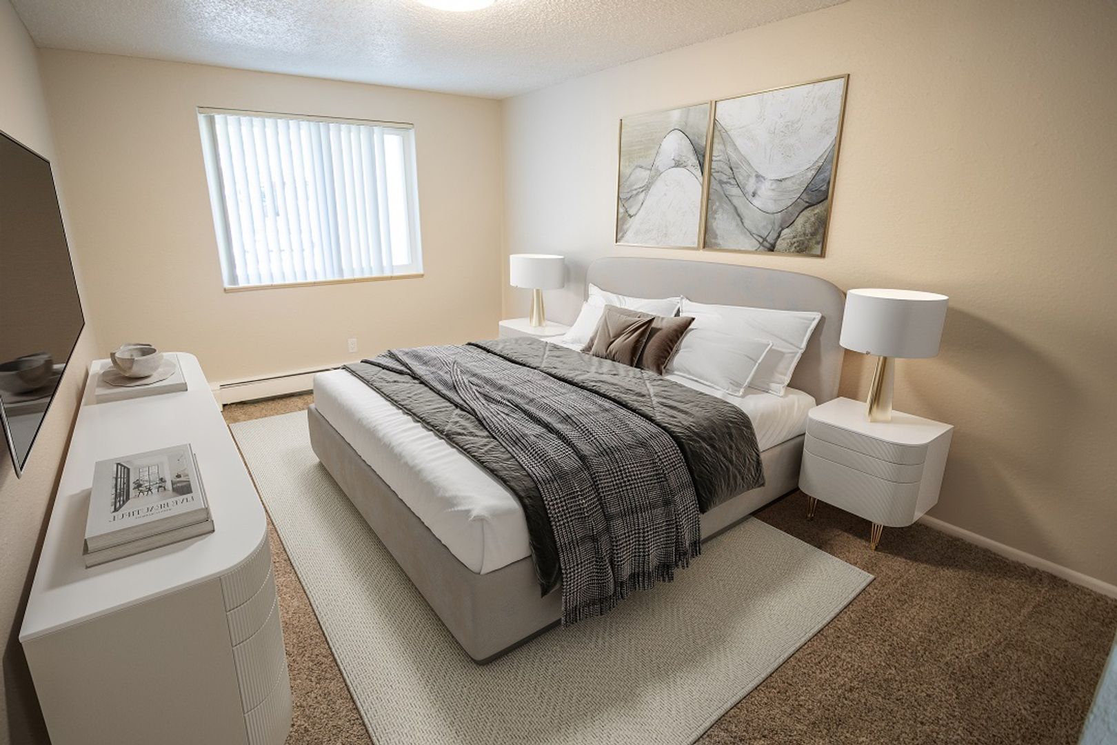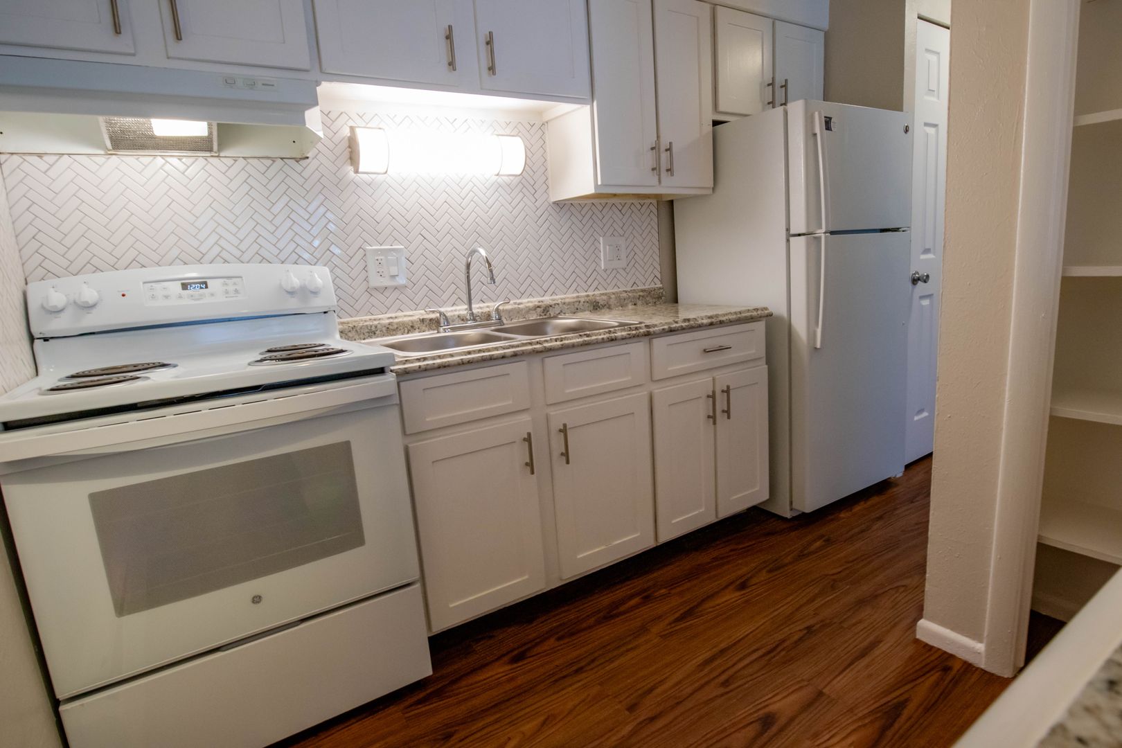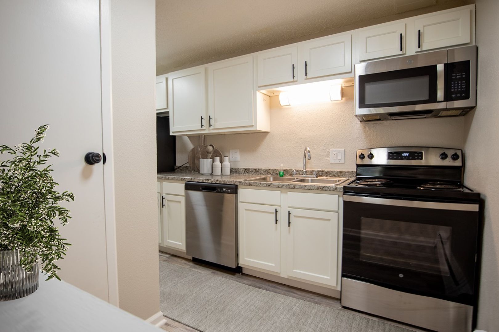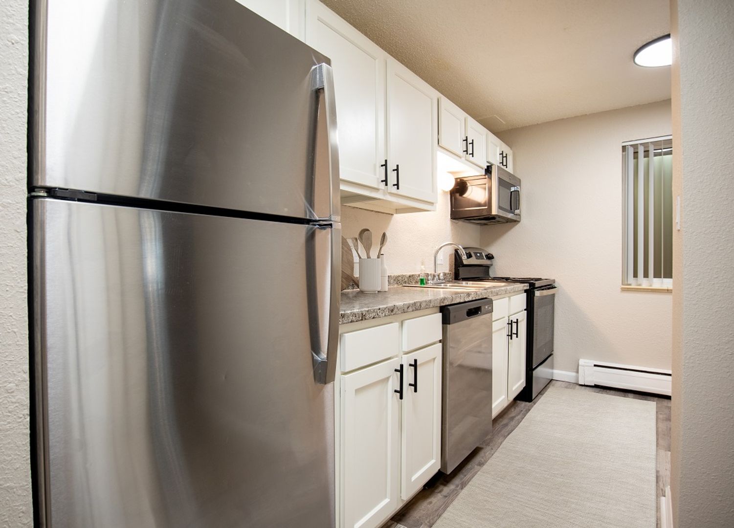 Each of our one-bedroom apartment homes comes standard with two-tone designer paint, modern vinyl flooring and adequate storage. Other amenities include brand-new Shaker style cabinets, noise-reducing triple-pane windows, sleek marble-like countertops, stainless-steel appliances and lustrous tile surrounds and backsplashes.